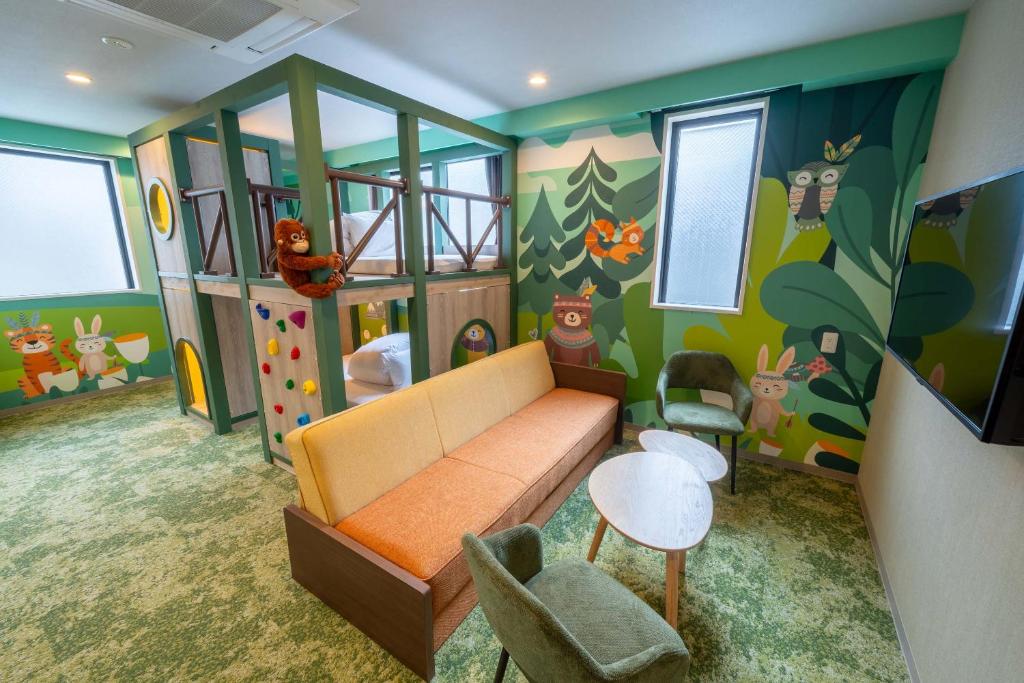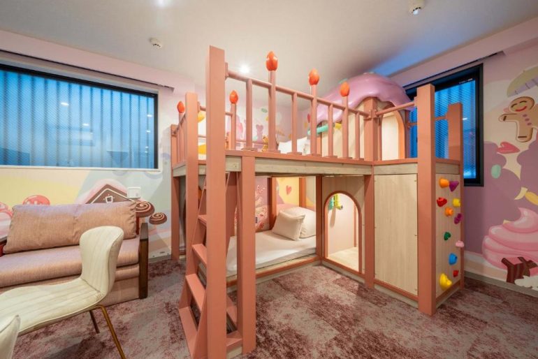 子どもが思いきり楽しめる空間づくりをコンセプトにした体験型アパートメントホテル。森・海・スイーツをテーマにした客室には、秘密基地のような二段ベッドや遊び心あふれる仕掛けが施されている。館内にはプロジェクションゲームやボルダリングウォールなどの遊び場も備えられており、客室外でも体を動かして楽しめる。キッチン付きの客室やコインランドリーもあり、子ども連れの家族旅行にも適した滞在が可能だ。