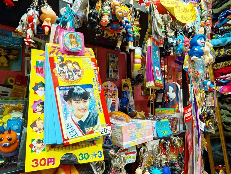 吊り橋ピュンでは、平成初期の古着に加え、懐かしのアイドルグッズなど多彩なアイテムが揃う。