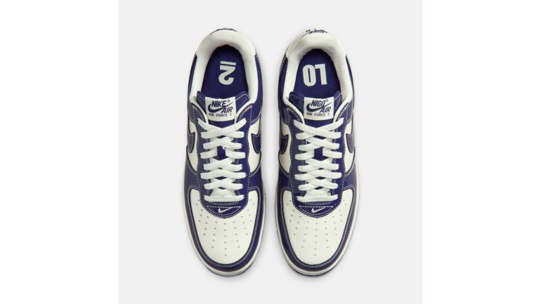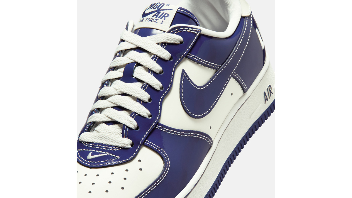 LO2とNOWHEREの影響は、NIGOによる初のエア フォース 1 シルエットに明確に表れている。セイルとロイヤルブルーを基調としたカラーリングは、象徴的な店舗の正面に掲げられていたオリジナルのNOWHERE サインと色を合わせたものだ。