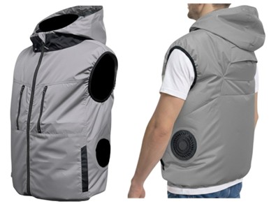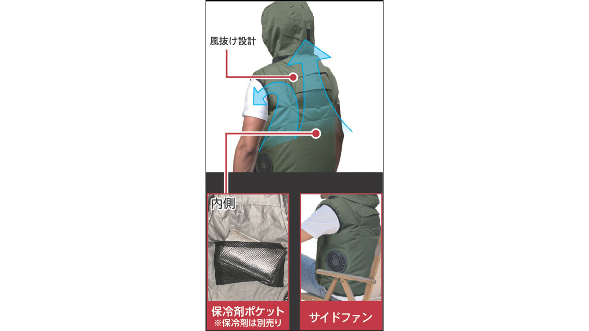 特徴:フード付きのデザインにより、ファンから取り込んだ風を首元や頭部に効率よく送り込むことができ、熱がこもりやすい頭部の温度上昇を抑える。
