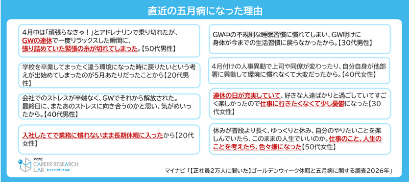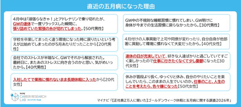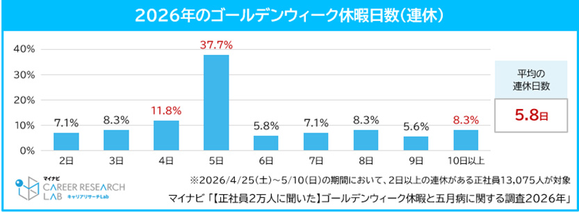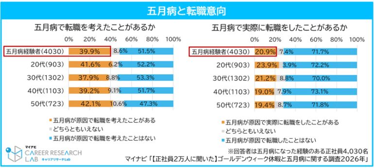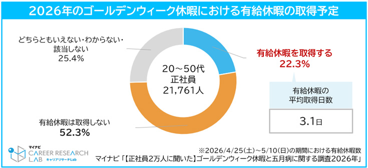 マイナビはこのほど、20~59歳の正社員2万1761人を対象に実施した「【正社員2万人に聞いた】GW休暇と五月病に関する調査2026年」を発表した。