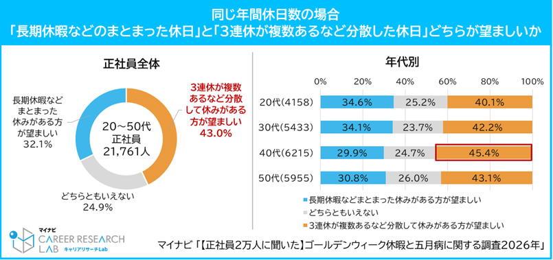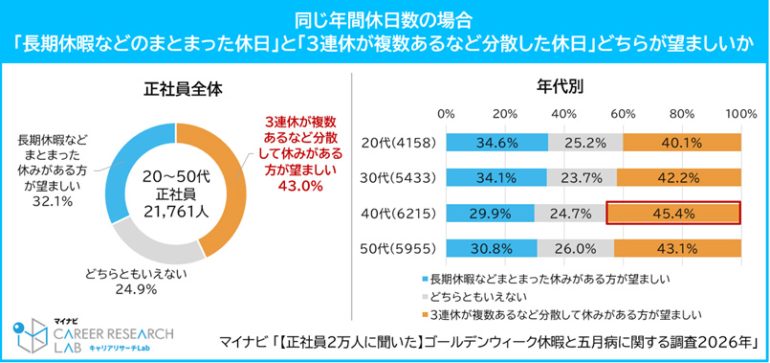 正社員の4割以上は、同じ年間休日数なら「3連休が複数あるなど休みは分散している」方が望ましい。仕事復帰が大変だと感じる連休日数は平均10.2日間
