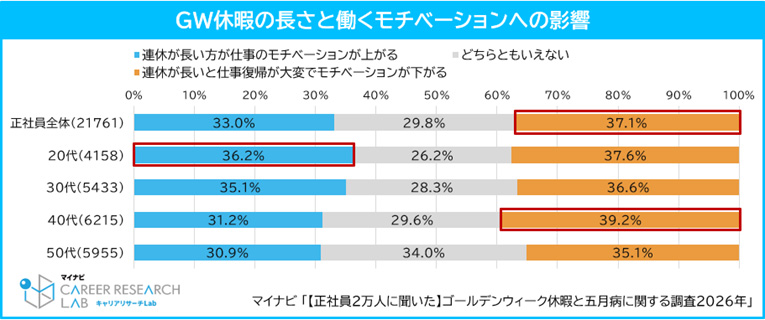 また、GW休暇の長さと働くモチベーションへの影響について聞くと、「連休が長い方が仕事のモチベーションが上がる(33.0%)」と感じる人より、「連休が長いと仕事復帰が大変でモチベーションが下がる(37.1%)」と感じる人の方がやや多い結果となった。年代別では、特に20代で「連休が長い方が仕事のモチベーションが上がる(36.2%)」が高く、40代は「連休が長いと仕事復帰が大変でモチベーションが下がる(39.2%)」の割合が高かった。