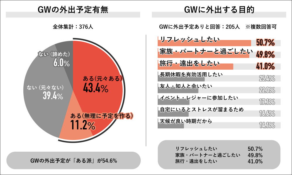 回答者全体の376人に、GWの外出予定有無を聞くと、「元々ある」が43.4%、「無理に予定を作る」が11.2%となり、54.6%と過半数がGWに外出予定があると回答した。