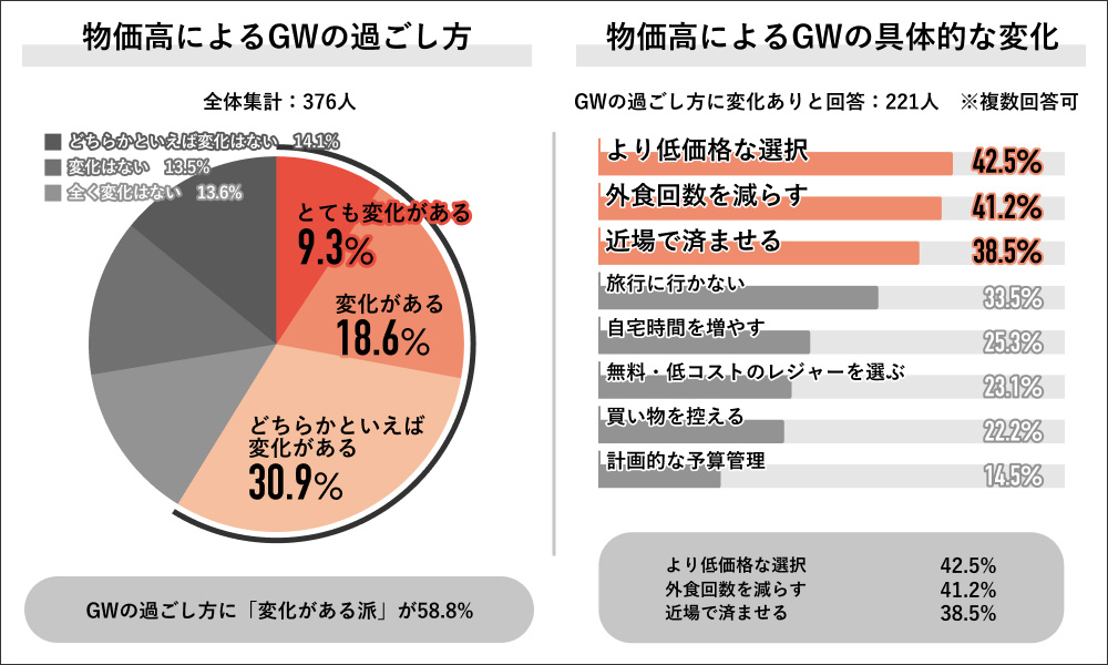 回答者全体の376人に、物価高の影響でGWの過ごし方に変化があるかを聞くと、「とても変化がある」が9.3%、「変化がある」が18.6%、「どちらかといえば変化がある」が30.9%となり、58.8%の人が物価高の影響でGWの過ごし方に変化があると回答した。