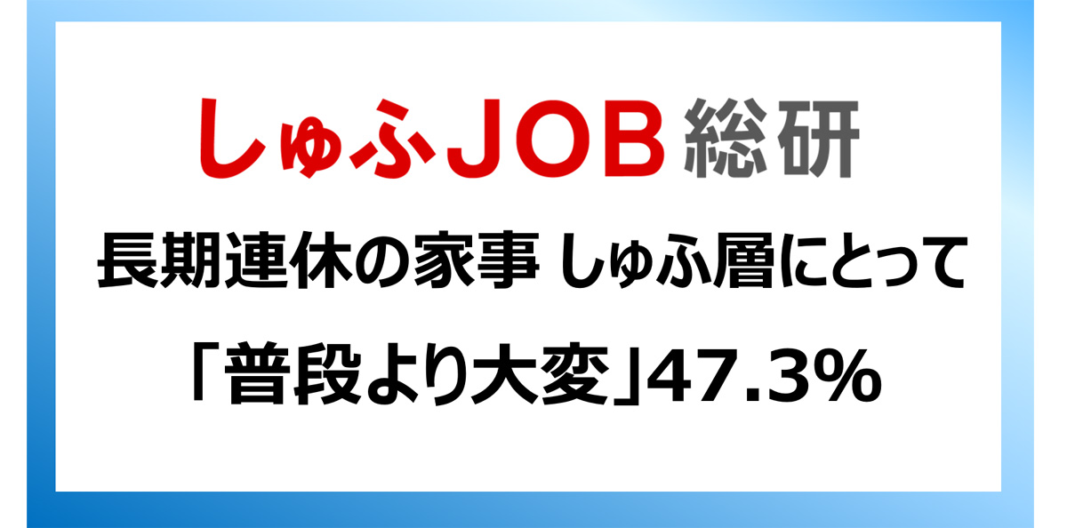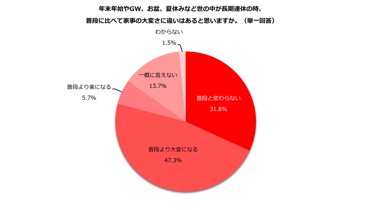 また、ゴールデンウイーク(GW)など長期連休の時の家事の大変さについて尋ねると、「普段より大変になる」と回答した人が半数近い47.3%に上りました。世の中の休みは、主婦層にとってはむしろ大変になる傾向が伺えます。