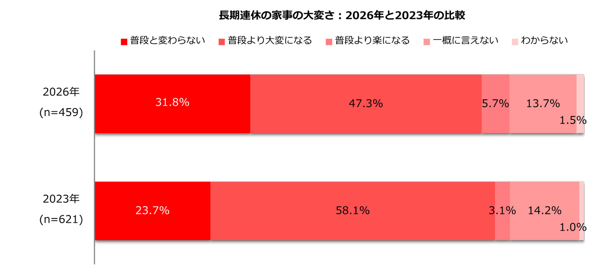 長期連休の家事の大変さを2026年と2023年で比較したところ、普段より大変になるの割合が2023年は58.1%だったのに対し、2026年では47.3%となっている。