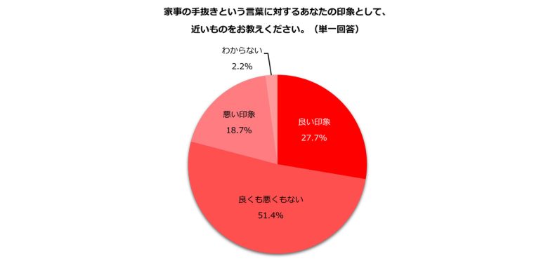 家事の手抜きという言葉の印象を聞いたところ、「悪い印象」は18.7%なのに対し、「良くも悪くもない」は51.4%であった。